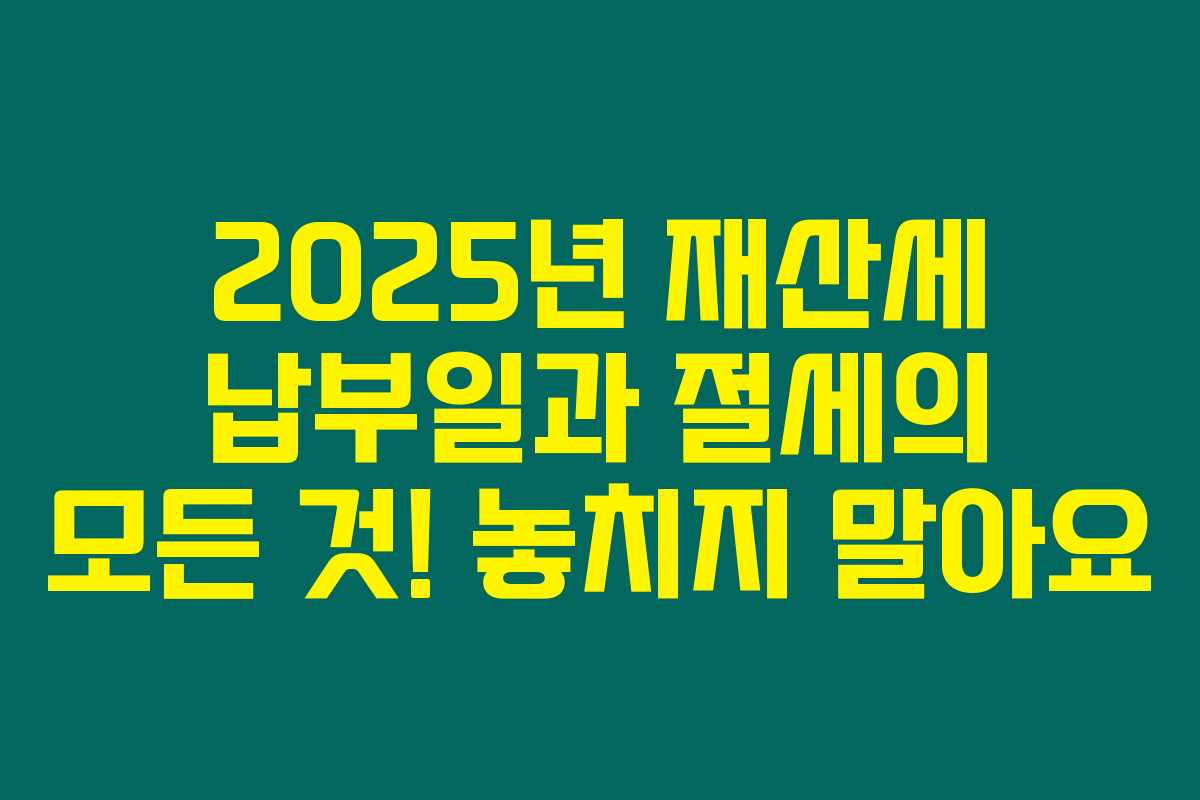 2025년 재산세를 미리 준비하지 않으면 큰 손해를 볼 수 있습니다. 재산세 납부일과 절세 방법을 제대로 익히고 있지 않다면 불이익이 따를 수 있어요. 아래를 읽어보시면 2025년 재산세 납부일과 절세 전략까지 완벽하게 정리한 내용을 확인할 수 있어요!