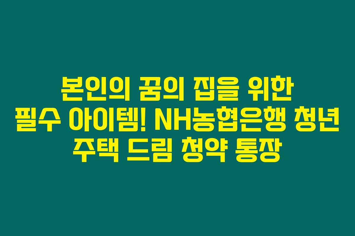 청약 통장은 본인의 주택을 확보하는 중요한 수단입니다. 특히, 시간이 지나도 변치 않는 주택 청약의 필요성을 느끼는 청년들이 늘어나고 있습니다. 가까운 미래에 내 집 마련을 꿈꾸는 청년 여러분께는 NH농협은행 청년 주택 드림 청약 통장이 꼭 필요할 거예요.