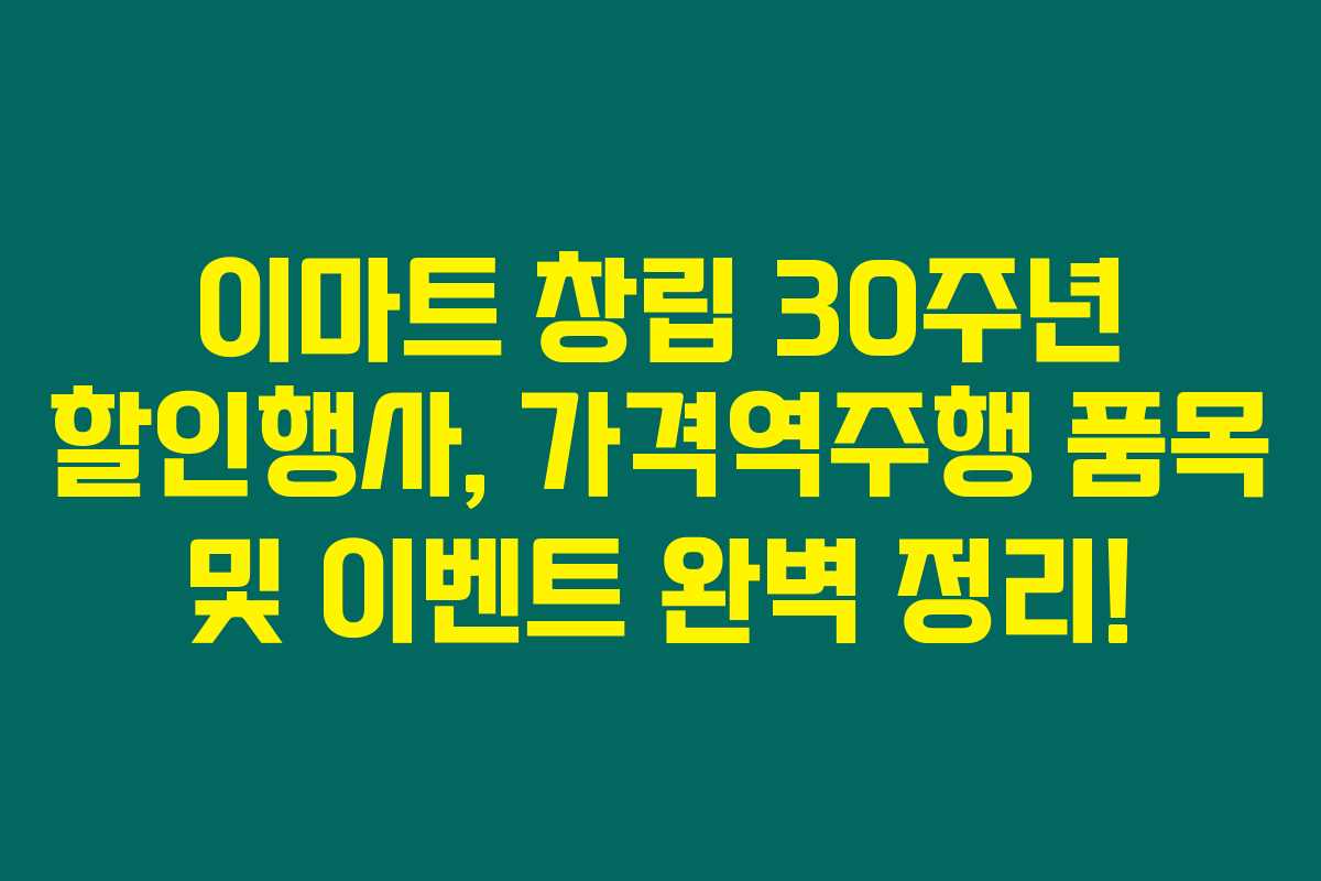 이번 이마트 창립 30주년 할인행사는 여러분의 장바구니를 더욱 가볍게 만들어줄 기회입니다. 놓치면 후회할 찬스를 적극 활용해 보세요! 여러분의 지갑을 기쁘게 만들어줄 이번 할인행사를 꼭 활용하시기 바랍니다!